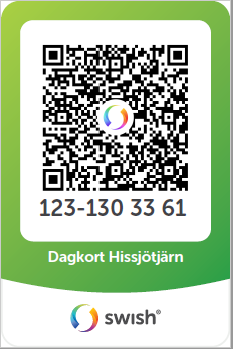 ![]() | Dagkort för en person för fiske i Hissjötjärn. Max 3 regnbågar per fiskekort får fångas och max ett kort får köpas per dygn. |